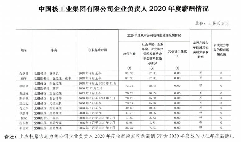 注:如有中央企业一把手在2020年内发生人事变更,该表优先选取2020年内在职时间较长人员。如需了解各中央企业所有负责人2020年度薪酬情况请在下方查看。