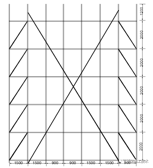 4)双排脚手架的斜杆或剪刀撑设置应符合下列要求:沿架体外侧纵向每5跨每层应设置一根竖向斜杆或每5跨间应设置扣件钢管剪刀撑,端跨的横向每层应设置竖向斜杆。