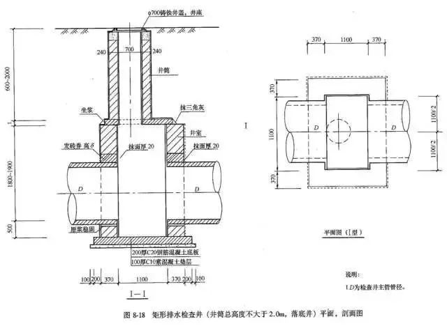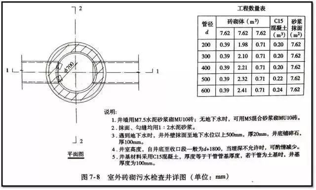 不需要下井的浅检查井,井身为直壁圆筒形;需要下井的其井身在构造上分为井室、渐缩部、井筒三个部分。井室直径不小于1m,井筒直径不小于0.7m。井室与井筒间以渐缩部连接。也可在井室上加钢筋混凝土盖板,在盖板上砌筑井筒。位置:道路交叉口,直线上一定距离(25-50m)处,路缘石低洼地。功能:排除泄水阀所排放水,由湿井与阀门井相连组成。功能:防止管道的承插接口因承受过大的水流推力,而导致接口脱落。标准规定,室外工程应标注绝对标高;无绝对标高时也可标注相对标高。 公称直径:DN,常用于金属管材。如:铸铁管DN25。外径:D×δ,常用于不锈钢管、无缝钢管。如:不锈钢管D108×4。内径:d,常用于混凝土管、陶土管等。如:钢筋混凝土管d300。表明管道的平面位置,管道直径、长度、坡度,检查井位置、编号,水流方向等。比例:1:500或1:1000,与道路施工图一致。附属构筑物:图例表示井编号,如W5,5号污水检查井。 表示地面起伏情况,管道敷设深度,管道直径及坡度,与其他管道交接情况。比例:竖向比例常为横向比例的10倍n线形;粗双线—管道,粗实线—地面,双竖线—检查井。支管标注:SYD400—方位、代号、管径,即表示由南向接入的直径400mm的雨水管道。- 设计路面标高:由道路中线设计标高,道路横坡,检查井距道路中心线的距离而推算。