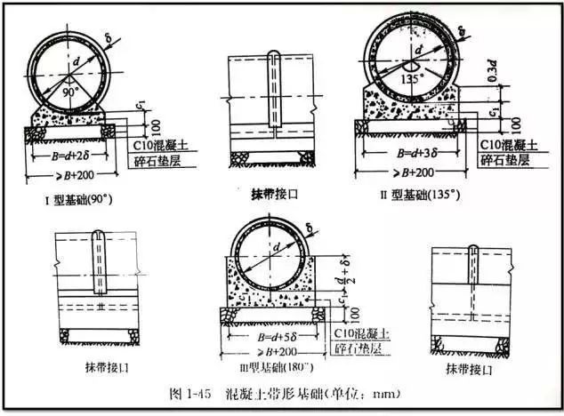 沿管道全长铺设带状水泥混凝土,适用于各种土质,特别是土壤条件差、震区、重要管道等。按管座的形式,分为90度、135度、180度、360度四种管座基础,根据管道埋置深度选择。功能:便于对管道衔接以及定期检查和疏通。