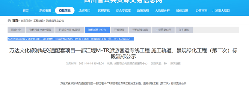 2021年10月14日,万达文化旅游城交通配套项目—都江堰M-TR旅游客运专线工程施工轨道、景观绿化工程(第二次)标段流标公示。