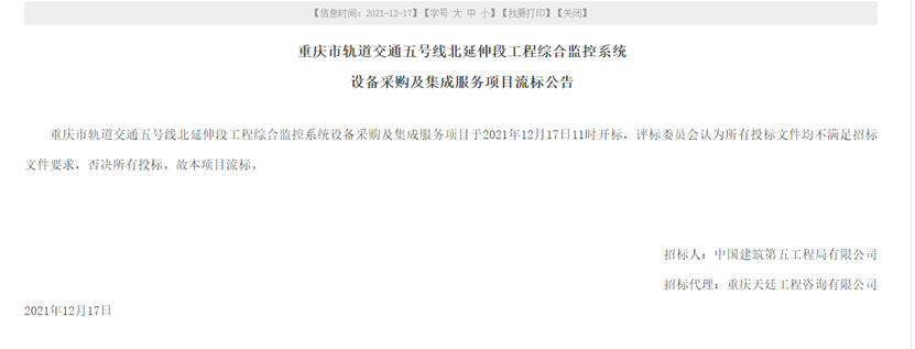重庆市轨道交通五号线北延伸段工程综合监控系统设备采购及集成服务项目于2021年12月17日11时开标,评标委员会认为所有投标文件均不满足招标文件要求,否决所有投标。故本项目流标。