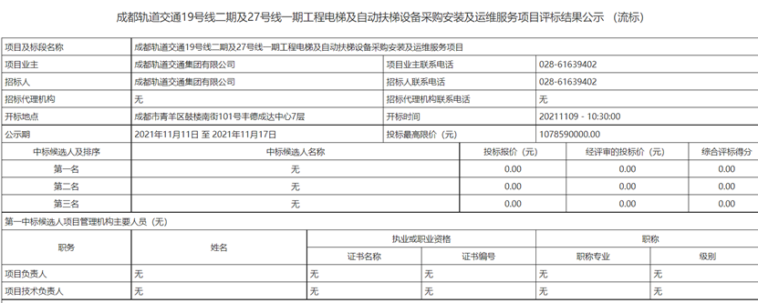 同样,《成都轨道交通19号线二期及27号线一期工程电梯及自动扶梯设备采购安装及运维服务项目评标结果公示(流标)》,八家单位废标。