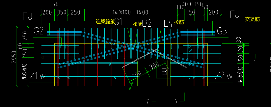 从预制墙剖面图中可以看出墙中已经预制了连梁的交叉筋、箍筋、腰筋、拉筋、下部纵筋,并配合看墙的钢筋明细表,发现预制墙中已经给出了连梁的上述钢筋,即定义连梁时只定义面筋即可。