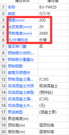 2、输入预制墙属性,本案例中预制墙厚度为200,坐浆高度如图所示为20,预制段高度如图所示为2680,现浇段高度软件通过墙高-预制高度-坐浆高度反算,不用手工输入。