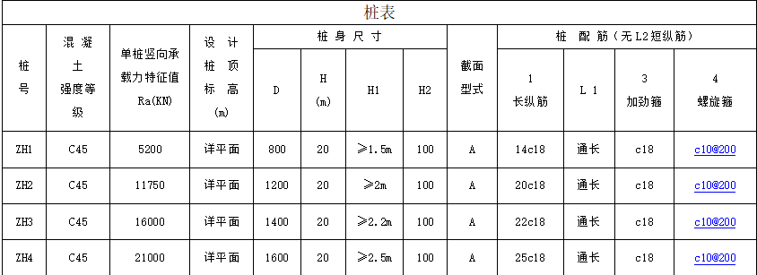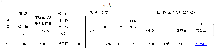 注:1.关注表格内桩直径、桩长以及配筋,结合详图
