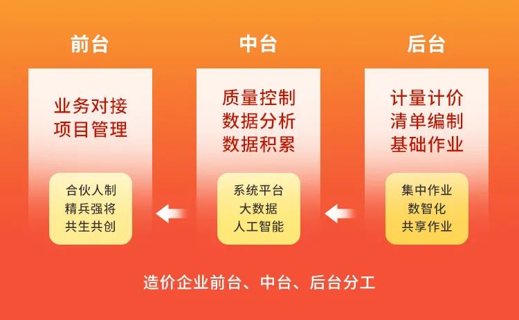 尹老师的观点是造价公司要通过业务流程再造,把传统业务流程区分为前、中、后台,把后台建设成为作业中心,以降低人工成本,提高效率。