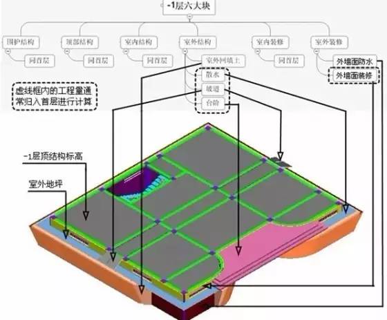 -1层属于半地下室,部分埋在地下,部分埋在地上,其中围护结构、顶部结构、室内结构、室内装修所包含的构件同首层,室外结构里的回填土在基础层里已经统计过了,室外结构里的散水、台阶、坡道从标高角度讲应该归-1层所有,但是图纸一般将这些构件都画在首层,所以散水、台阶、坡道通常都归入首层计算。-1层的室外装修这里变成了两部分,其中埋入地下部分变成了室外装修,露出地面部分属于外墙装修,一般也归入首层计算。见图19: