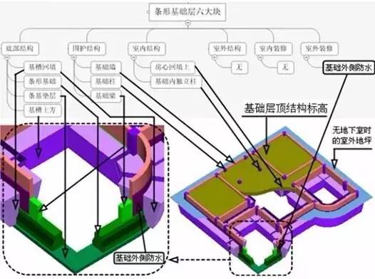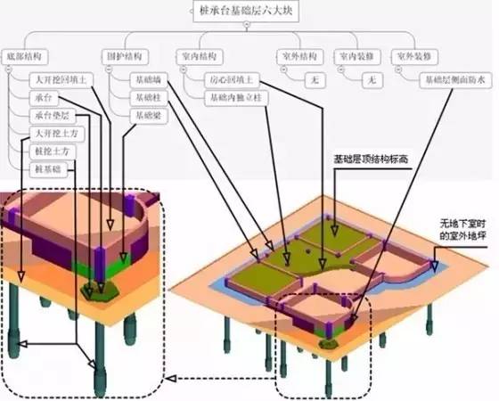 基础层仍然按照六大块的原理进行分解,只是把顶部结构换成了底部结构,根据基础类型不同分为筏形基础、条形基础、独立基础、桩承台基础。