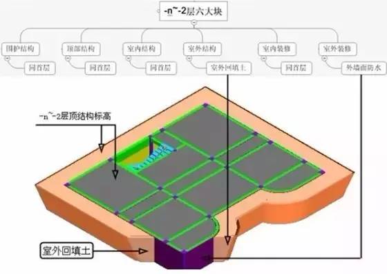-n~-2层全部埋在地下,属于全地下室,其中围护结构、顶部结构、室内结构、室内装修所包含的构件同首层,室外结构变成了回填土,我们在基础层已经统计过了,室外装修变成了外墙防水,见图18: