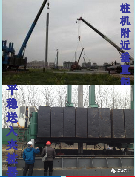 预制管桩在起吊前,在桩身上设置尺寸标识(每1m设置一道),以便在施工中观测记录。起吊预制管桩时,采用布质吊运至桩机边,开始垂直起吊,平稳的将桩送到压桩机夹桩器中,同时使劲性桩中心对准桩位,开动桩机油泵抱桩、固定、下压预制管桩,缓缓下压插入土中约50cm。