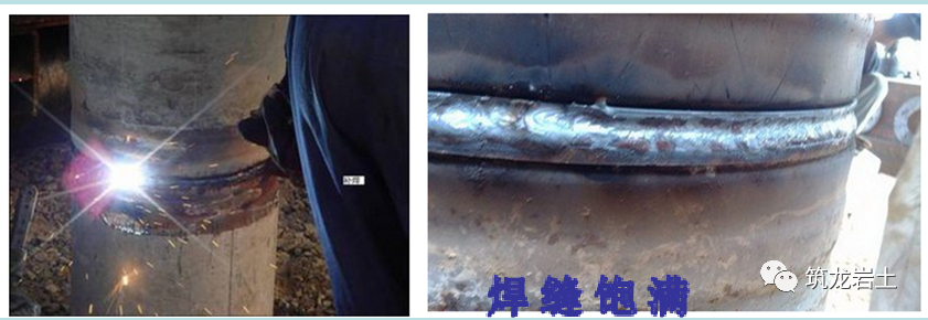 ④上下桩节固定后分层对称施焊。焊缝必须饱满,不得出现夹渣或气孔等缺陷。接桩时,下节桩距地面预留1m左右高度,每根桩焊接完成后,应自然冷却至自然温度(焊接完成后,自然冷却至自然温度,一般不小于8min,严禁使用水冷却和焊完立即沉桩),经监理及现场技术员经蔽工程验收,验收合格后方可进行下步工作。