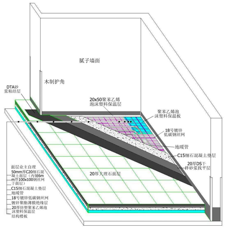 客厅、餐厅、卧室等户内房间楼面做法:1)钢筋混凝土结构板;2)地采暖层;3)50mm厚C20细石砼面层(内铺∅1.6mmx100x100钢丝网);4)预留40mm业主装修层。