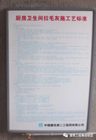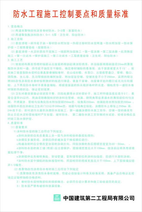 采用KT板制作,尺寸600mm*900mm,内容包括混凝土结构工程、砌筑工程、装饰装修工程、防水工程、建筑地面工程、给排水工程、电气工程控制要点及施工标准等。