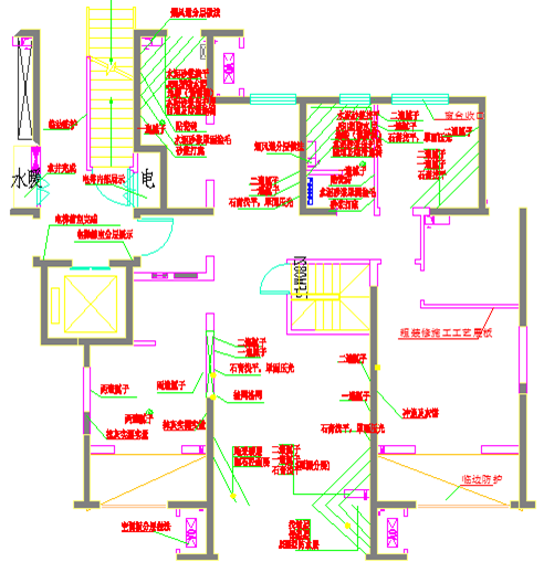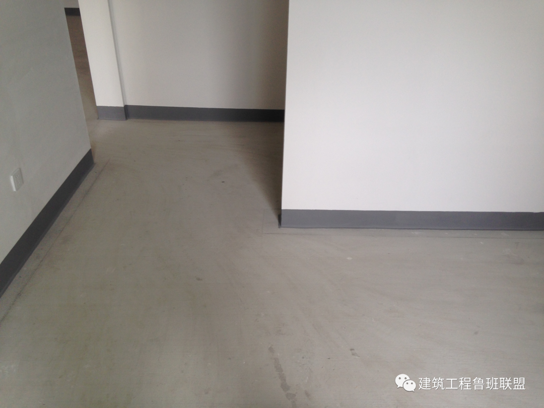 厨房卫生间地面分层做法,水电配合地漏、防水套管的安装,每隔200mm做一层,剖层角度45°。