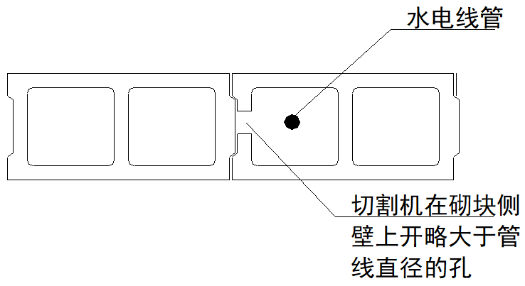 1)深化结构与机电图纸,进行BM连锁砌块与穿线管道、开关、电箱等相对位置的排布,在砖砌筑之前先按深化图打孔或切割,避免后期剃凿破坏墙体;2)由下至上的线管,砌筑时将砌块套入;由上至下的线管,砌筑时将砌块侧面开槽,将管线套入砌块中。