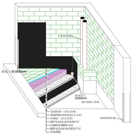 卫生间地面做法:1)钢筋混凝土楼板;2)20厚1:2.5水泥砂浆找平层;3)1.5mm厚JSII型防水层(上翻至建筑完成面以上1800mm);4)地采暖层;5)50mm厚C20细石混凝土面层;6)回填层及防滑面砖饰面层业主自理。
