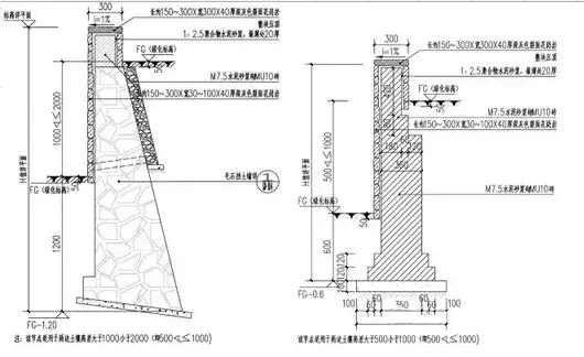 墙顶宽度最小,浆砌挡土墙不小于50cm,干砌不小于60cm。浆砌路肩墙墙顶一般宜采用粗石料或者混凝土做成顶帽,厚度为40cm,如不做顶帽,对路肩墙和路堑墙,墙顶应以大石块砌筑,并用砂浆勾缝,或用5号砂浆抹平顶面,砂浆厚2cm。干砌挡土墙墙顶50cm高度内,应用25号砂浆砌筑,以增加墙身稳定,干砌挡土墙的高度一般不宜大于6m。