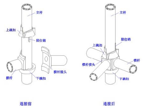 由碗扣接口 、 立杆 、 横杆 、 顶杆及可调托撑等组拼而成。