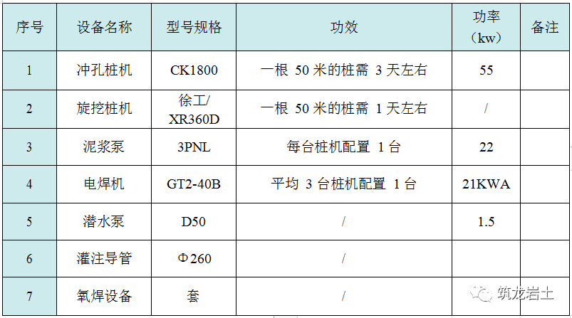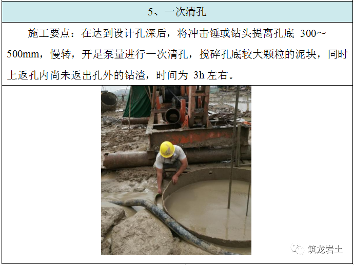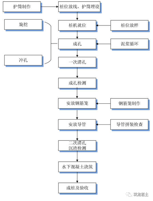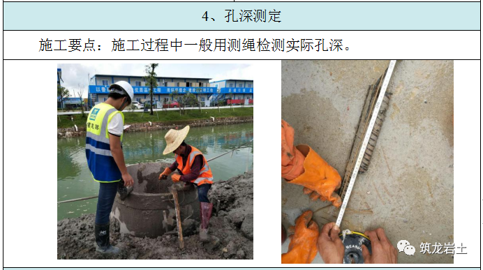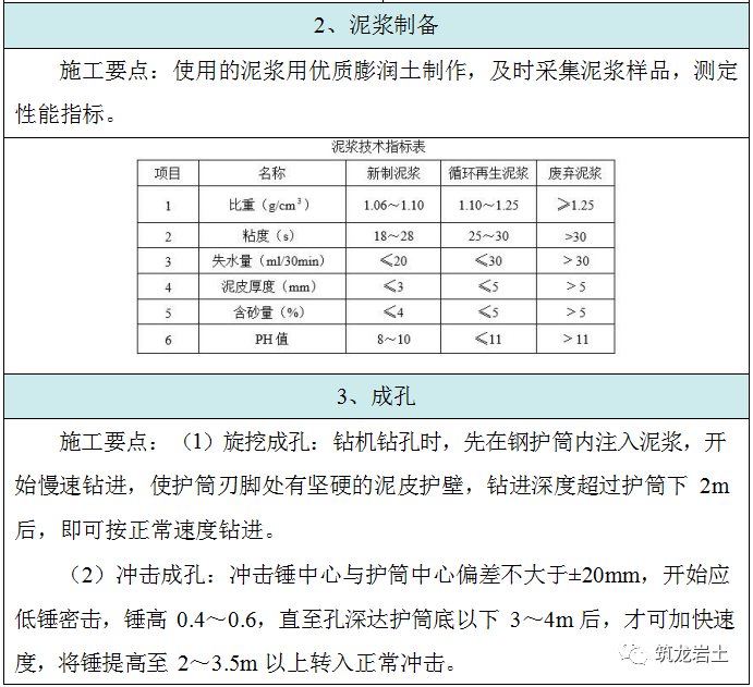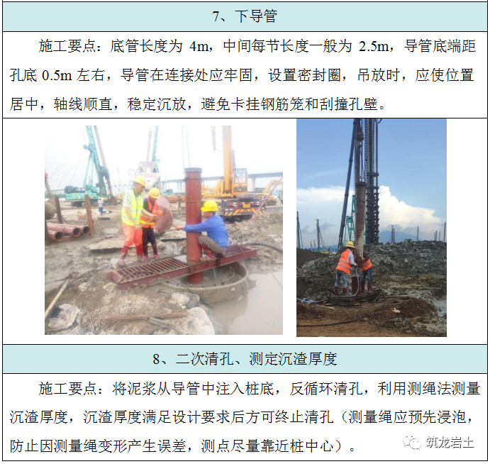 为确定钢筋笼顶标高,并保证钢筋笼的垂直放置,预先焊接两根等长度对称布置的吊筋,吊筋一般伸出孔口,作为判断钢筋笼上浮或下沉的依据。1)应先收紧内套钢丝绳将锥提起,检查锥的中心位置是否与护筒中心一致,检查锥架、底腿是否牢固,检查卷扬机和自动挂脱之间动作是否灵活、可靠。2)应根据冲岩土的松散度选择合适的冲程:冲松散层宜选小冲程(0.5-1.0m);冲砂卵石宜选中等冲程(1-2m);当砂卵石较密实时可加大冲程(2-3m);在基岩中冲击钻进时,宜采用高冲程(2.5-3.5m)。3)冲孔时应及时将孔内残渣排出,每冲击 1~2m,应排渣一次,同时检查成孔的垂直度,如发生斜孔、塌孔或护筒周围冒浆时,应停机,待采取相应措施后再进行施工,相邻桩机不宜过近,以免互相干扰,在刚灌注完毕混凝土的桩旁进行另一根桩成孔施工时,其安全距离应大于 4D(D 为桩直径),或最少时间间隔不应少 36 小时,以防止坍孔。每次捞渣后,应及时向孔内补充泥浆或黏土, 保持孔内水位高于地下水位 1.5-2.0m。应根据不同的钻孔方法、施工设备、设计要求及地层条件,来合理选用清孔方法。a.抽浆法清孔:抽浆法清孔较彻底,且清孔速度快,可适用于各类土层、各种钻孔方法的摩擦桩或支承桩,但在孔壁易坍塌的桩孔中应谨慎使用,以防坍孔。b.换浆法清孔:对以粘性土及细颗粒砂性土层为主的桩孔可采用换浆法清孔。采用该法清孔不易引起坍孔,但清孔速度慢,须控制好泥浆指标及清孔时间, 否则清孔效果难以保证。c.掏渣法清孔:对于冲击、冲抓、旋挖钻进的桩孔,应先采用掏渣法进行初步清孔,待较大颗粒沉渣清理完毕后,可换用换浆法进一步清孔,同时降低孔内泥浆密度。d.喷射法清孔:在导管等混凝土灌注设备已安装,实测孔底沉渣厚度超出规定或设计要求,但超出范围不大,进行二次清孔费时费力,且影响孔壁稳定的情况下,可采用喷射清孔法进行处理,并立即灌注水下混凝土。该法仅宜作为其他方法清孔的辅助手段。清孔持续时间应根据具体清孔方式、地质情况及孔底排出的泥浆指标确定, 抽浆法清孔的速度较快(一般不少于 10min 即可),换浆法清孔速度较慢(30min 至数小时不等),无论采用何种清孔方式,均应确保清孔持续时间,否则难以达到清孔效果。a.清孔过程泥浆指标清孔过程中泥浆密度一般应比钻孔泥浆密度小,但泥浆密度及粘度过小,影响孔壁稳定;采用正循环清孔时,泥浆密度及粘度过小,还会影响泥浆悬浮钻渣的能力,降低清孔效果。在粘性土、粉土及粉砂土为主的土层中,清孔过程中输入泥浆指标宜控制为:相对密度 1.05~1.10;粘度 16~20Pa·s;含砂率<4%。b.终止清孔泥浆指标终止清孔前应在孔底取泥浆进行性能指标检测,终止清孔泥浆指标一般控制在以下范围:相对密度 1.03~1.15;粘度 17~20Pa·s;含砂率<4%;胶体率>98%。4)缩短施工历时在确保清孔效果的同时,应加强工序衔接,提高工作效率,尽量缩短清孔至混凝土灌注之间的的时间间隔。5)进行首批混凝土灌注前,再次探测泥浆指标及孔底沉渣层厚度,如超过规定要求时,立即进行再次清孔,直至符合要求时方可灌注水下混凝土。根据建筑工程《地基基础工程施工质量验收规范》(GB 50202-2018),混凝土灌注桩的质量检验标准应符合表中的规定。