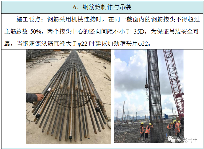 (1)灌注桩需提前用超前钻做施工勘察,避免将孤石作为承载岩层。(2)钢材、水泥等原材料的质量、检验项目、批量和检验方法,应符合国家现行标准的规定。(3)应严格对桩位进行检验,桩位的放样允许偏差群桩为 20mm,单排桩为10mm。(4)钢筋笼制作应对钢筋规格、焊条规格、品种、焊口规格、焊缝长度、焊缝外观和质量、主筋和箍筋的制作偏差等进行检查,钢筋笼制作允许偏差应符合规范要求。