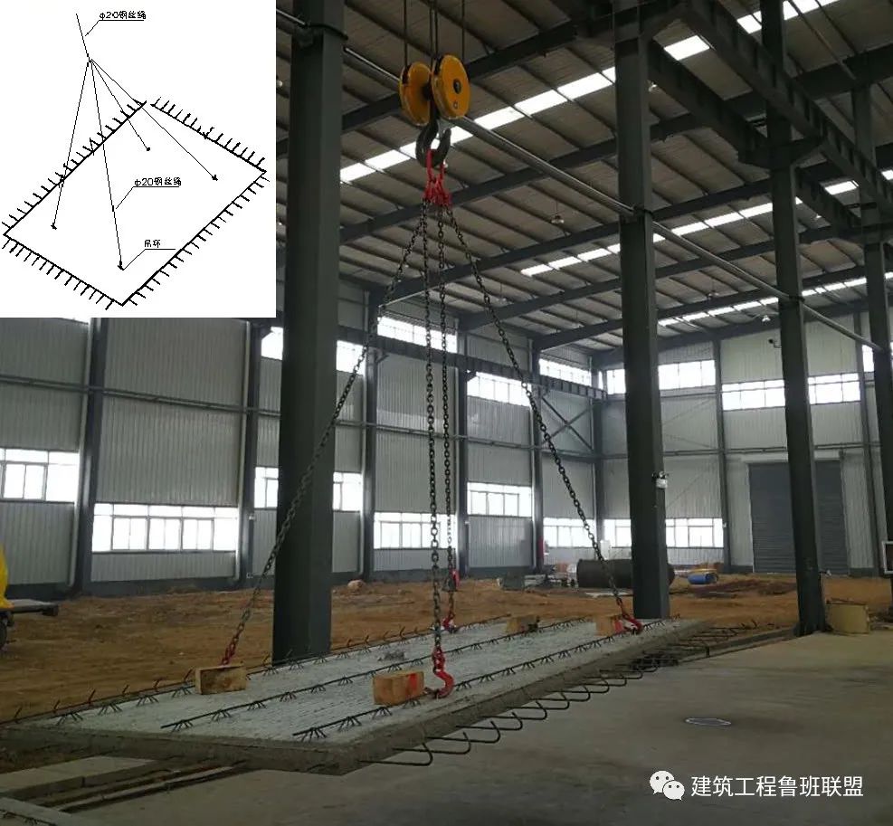 叠合板起吊时,要尽可能减小在非预应力方向因自重产生的弯矩,采用钢扁担吊装架进行吊装,4个吊点均匀受力,保证构件平稳吊装,如下图所示。起吊时要先试吊,先吊起距地50厘米停止,检查钢丝绳、吊钩的受力情况,使叠合板保持水平,然后吊至作业层上空。