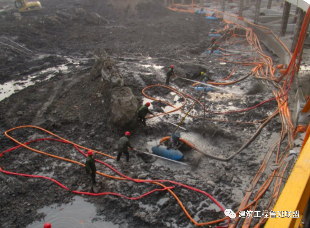每台浮筒泥浆泵配置两个高压水枪,两名施工人员进行施工;先冲挖环撑下方土方,冲挖完成后冲挖环撑外土方;土方被高压水柱打碎混合为泥浆后由泥浆泵抽取。