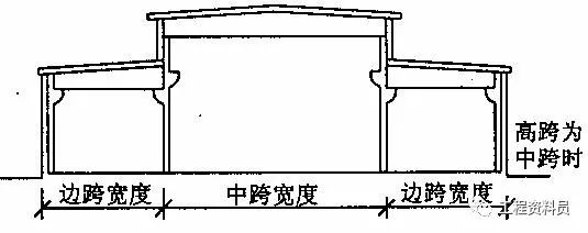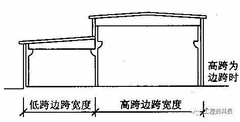(1)当高跨为边跨时,其建筑面积是按勒脚以上两端山墙外表面的水平长度乘以勒脚以上外墙外表面至跨中柱外边线的水平宽度计算。