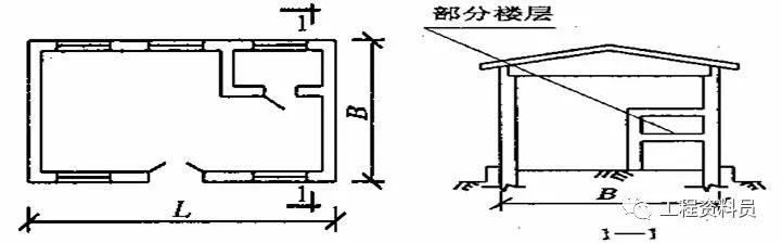 单层建筑物内如带有部分楼层者,亦应计算建筑面积。这部分主要指厂房、剧院、礼堂内的部分楼层。如图所示,只计算二层以上楼层面积,底层不再计算面积。如车间内为生产服务而建的单层房间,这部分不再另计建筑面积。