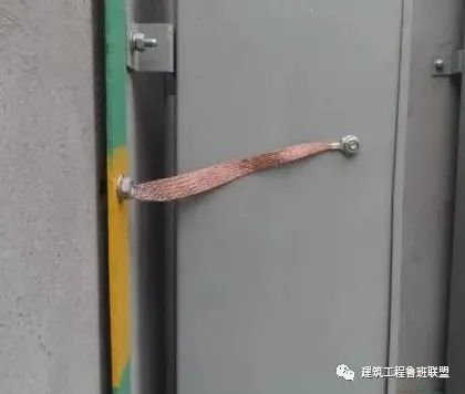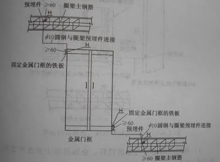 等电位联结线与金属门的连接(如示意图):采用φ10的圆钢,一端与圈梁预埋件焊接牢固,另一端通过搭接板(100㎜x30㎜x3㎜的镀锌扁钢)与固定门框上的预埋铁板连接。连接位置宜在门内侧的上端或下端。
