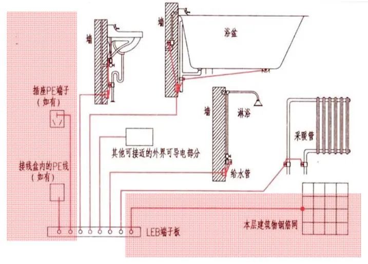 3、浴室内的等电位联结不得与浴室外的PE线相连,以防故障时引入危险电位。如浴室内有PE线,则必须要与该PE线做联结(例如插座线的PE端子或接线盒内的PE线);