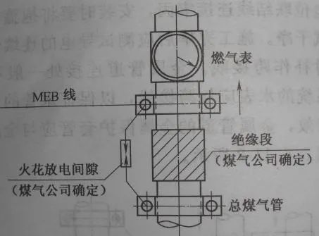 等电位联结线与燃气管道的连接(如示意图):为避免用燃气管道做接地极,燃气管入户后应插入一绝缘段(例如在法兰盘间插入绝缘板)与户外埋地的燃气管道隔离。防止雷电流在燃气管内产生火花,在此绝缘段两端应跨接火花放电间隙。