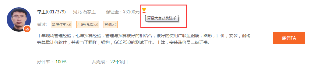 1、“找项目”页面,获奖人都会有一个奖杯形的勋章,鼠标移动上后会提示“算量大赛获奖选手”