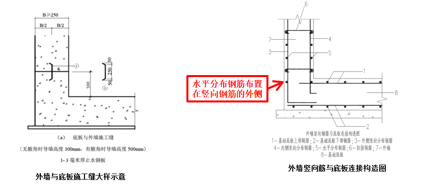 (4)为利于控制裂缝,地下室外墙将水平分布钢筋布置在竖向钢筋的外侧。当地下室外墙设有附壁柱时,应在附壁柱处沿竖向原有水平分布钢筋间距之间增加直径为 8mm、长度为柱每边伸出 800mm 的附加钢筋,做法如下图。