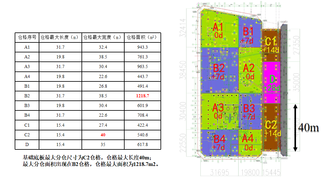 本工程因基坑施工面积大,针对如何确保混凝土结构施工后杜绝出现贯通裂缝现象,控制结构表面裂缝这一问题,项目部对施工方案进行了对比分析,结合近年来不少工程取消后浇带改用“跳仓法”获得成功经验,经公司与项目部研究论证,提出优化建议,决定取代原设计后浇带及膨胀加强带施工法,采用“跳仓法”施工。