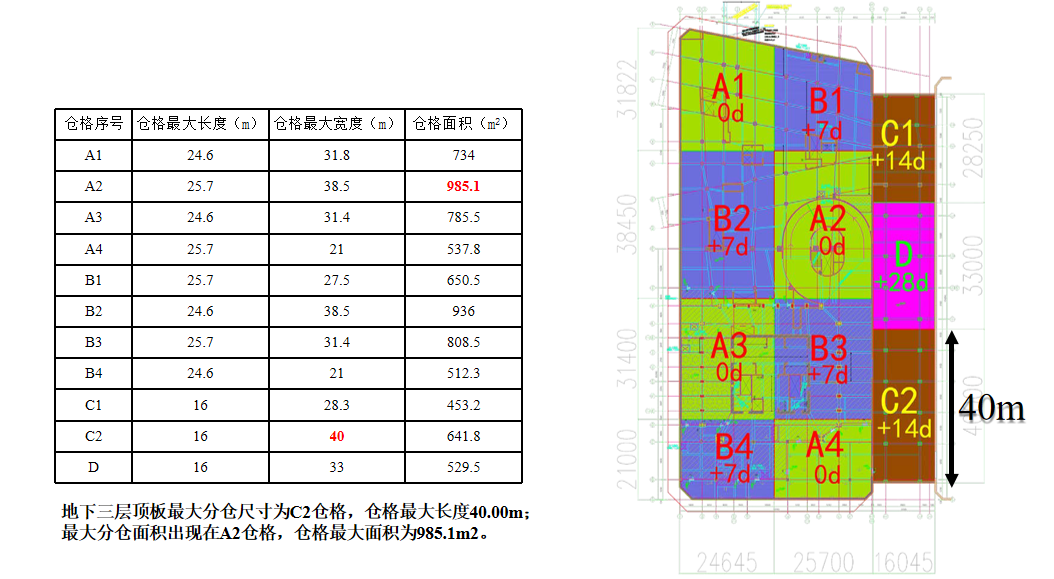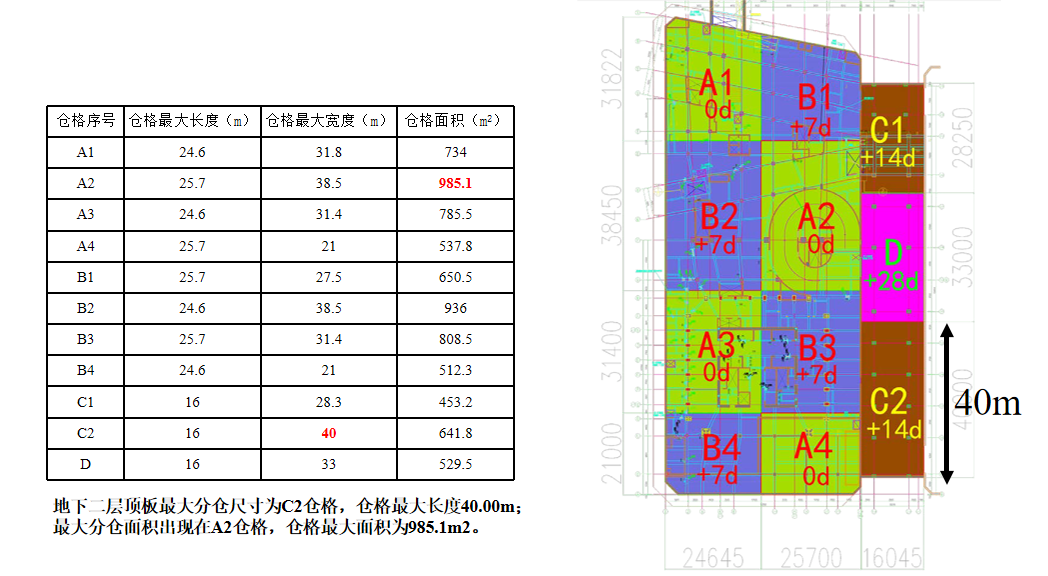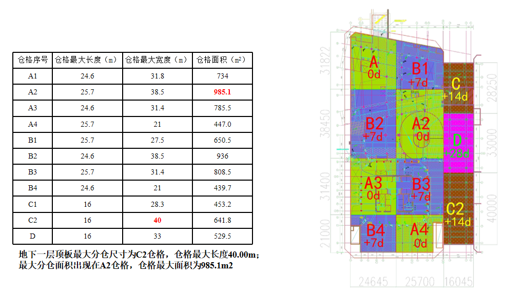 本工程对基础底板、地下四层顶板、地下三层顶板、地下二层顶板、地下一层顶板、地下四层竖向构件、地下三层竖向构件、地下二层竖向构件及地下一层竖向构件 9 个位置分别进行跳仓方案设计,明确了每一部分的仓格划分形式、施工缝留设位置并根据施工分区确定施工顺序。