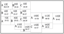 跳仓法适用于基础底板、地下室外墙和顶板等的施工,现以基础底板的施工为例来介绍跳仓法施工工艺。《超长大体积混凝土结构跳仓法技术规程》(DB11T1200-2015)规定,根据基础筏板面积大小沿纵向和横向分仓,仓格间距宜不大于 40m,并进行编号,如图所示。混凝土浇筑时,先浇筑A 区, 即“开放仓”,7 天之后再浇筑 B 区,再隔 7 天浇筑 C 区,即“封闭仓”。