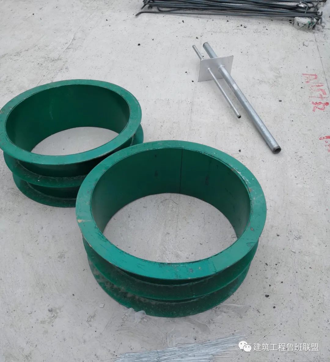 注意:套管与翼环验满焊,套管内外侧除锈,内测刷防锈漆两道,模板拆除后,外露的套管要刷防锈漆保护。