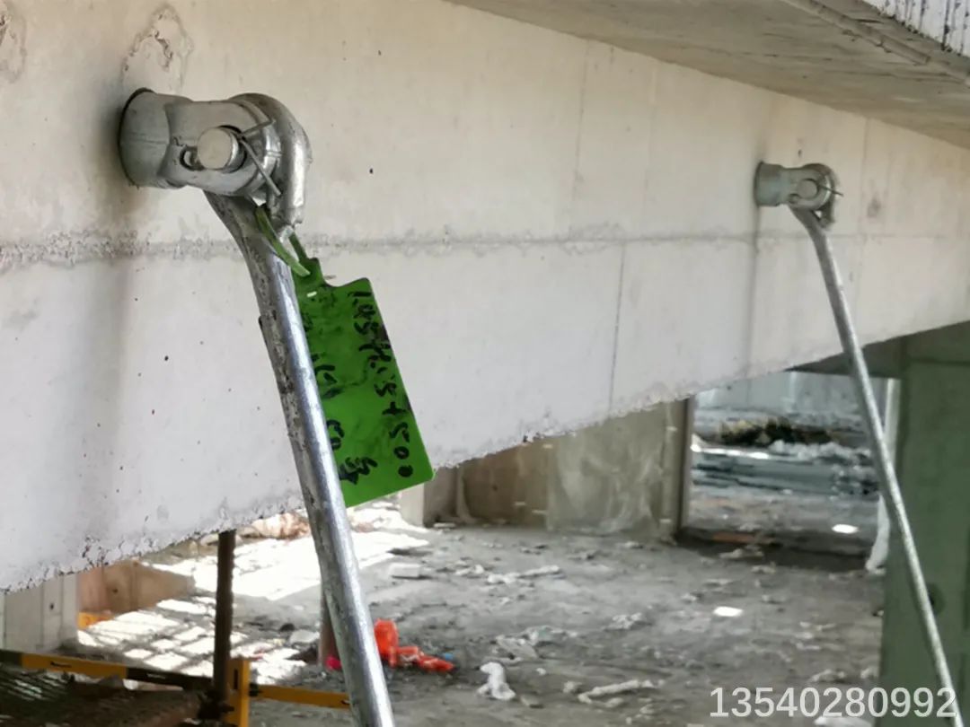 待外侧模板拆除,混凝土强度达到规定要求后(一般在砼浇筑后48小时左右),开始把“双耳拉环”扭入预埋件内连接,并将“斜拉杆”连接好,同时调节至受力状态。最后再将外架往上搭设至20米(以内)。