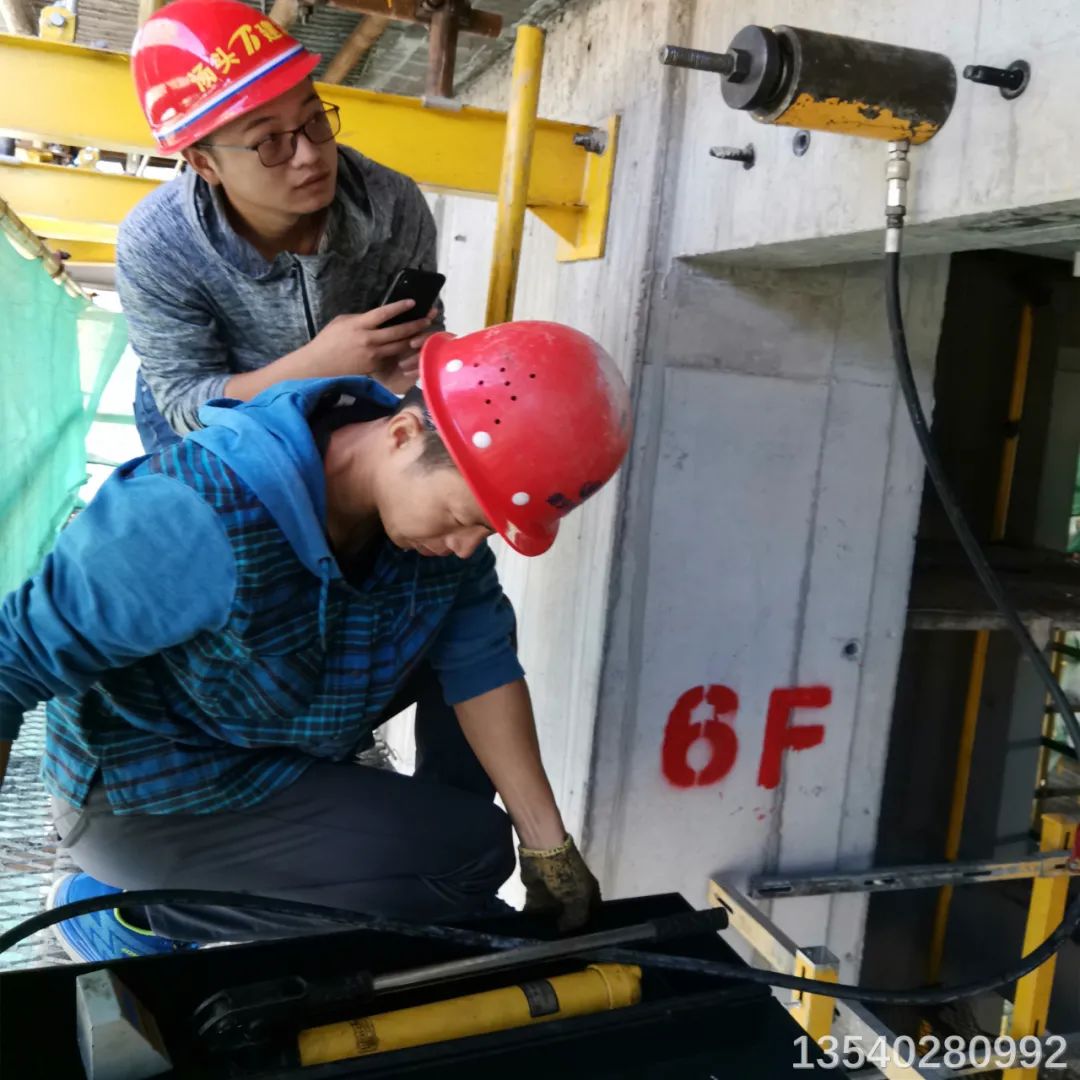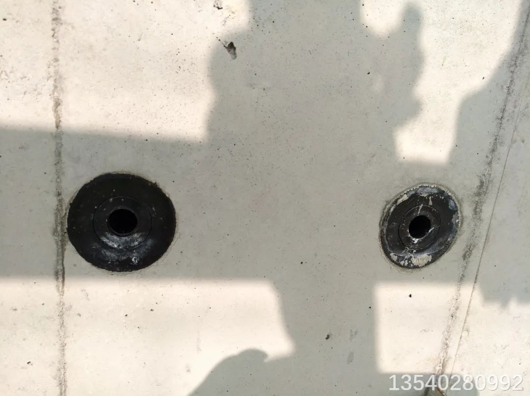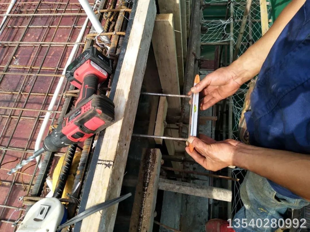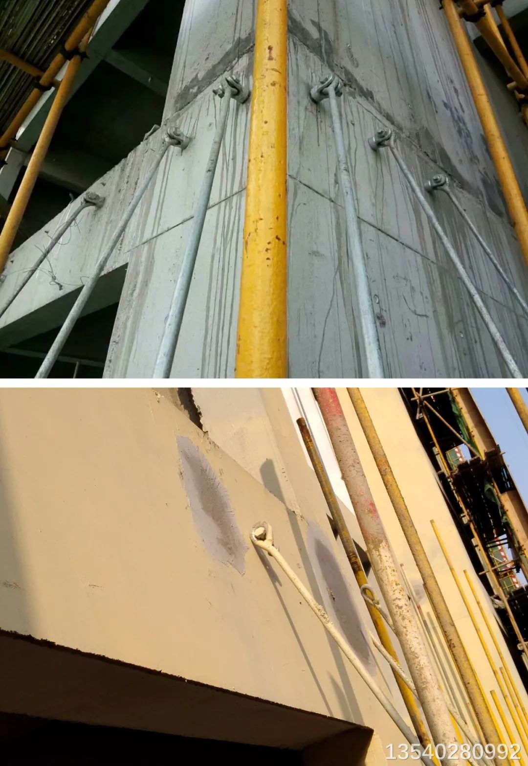 (2)安装双头螺杆时,考虑到混凝土强度还没有跟上来,扭力不宜过大,以免造成“对边的梁墙板”破裂。(见下图)