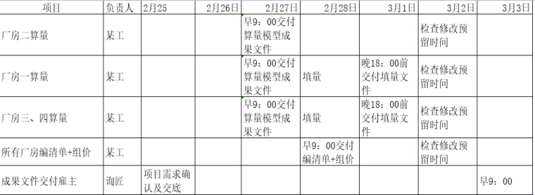项目经理对该项目工作进行WBS拆分,采取1+1+2模式,即项目团队配置为,1名复核人员,1名清单编制及组价人员及部分计量,2名独立计量人员,其中清单编制及组价人员为熟悉广东地区造价的广东算客,因其熟悉本地规则了解本地特性,故安排负责编清单组价+1个厂房的算量。为满足7天的项目工作周期,该项目采取的是并联工作方式,所有人员同步开展工作。