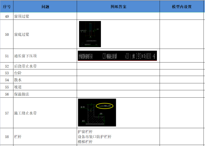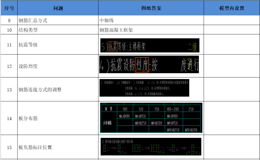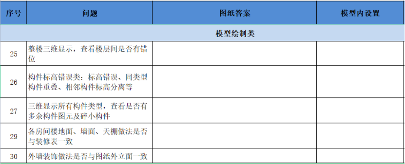 自检表,是算客在提交成果文件前进行自我质量检查,其中部分检查内容是项目经理前期需求交底时要求的,算客可根据该要求自行检,通常包括,公共设置问题、模型整体性检查、各构件特殊设置问题及零星构件等,下图截取了该项目部分自检表内容。