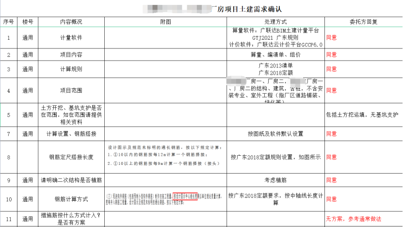 项目前期,项目经理认真梳理了项目需求,编制完成《项目需求确认表》,见下图。该确认表是项目质量预控的基础,也是后期质量检查的指引,包括项目使用的计算规则、工作范围、以及地基土方开挖方案、基坑支护方案、钢筋计算方式、钢筋定尺搭接长度等,当然也提出了图纸设计不完善或不明确的处理方法等。