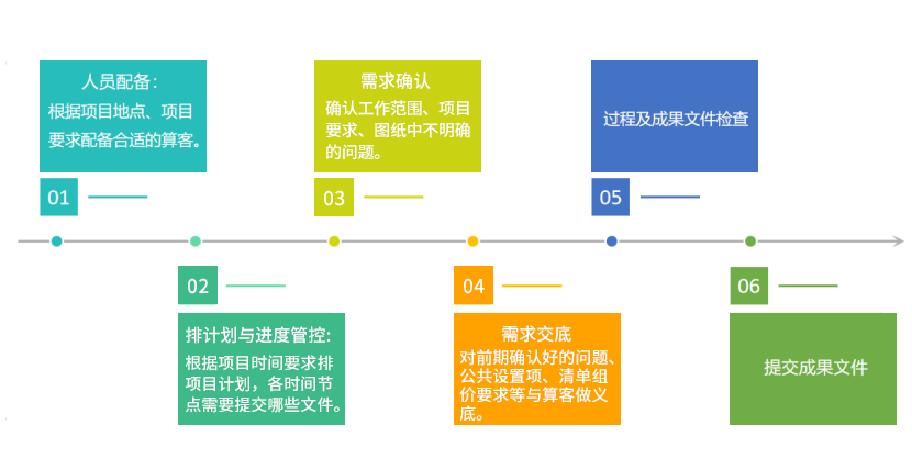 为保证项目质量,该项目从时间上设置了几个关键点,2月25日交底、2月27日交付模型文件及清单文件,进行第一次全面检查,目的在于复核算客对图纸和需求的理解,把控大原则大方向,遇到问题及时纠偏,有利于项目整体质量的把控。次日早算客交付完整的清单组价,以便进行复核及修改,否则会影响填量进度。3月1日进行填量文件检查,并过程中随时提交图纸答疑及清单编制阶段文件。其中27日模型文件检查,包括各单体相互检查、对比检查、单体模型文件检查等。3月1日填量文件检查,包括清单项与计量结果匹配性检查、图纸与清单对应性检查和填量后的造价结果检查等。3月1日晚对所有成果文件进行汇总并做全面检查,3月2日为修改完善阶段,用于第二次全面复核及修改问题。3月3日提交成果文件。