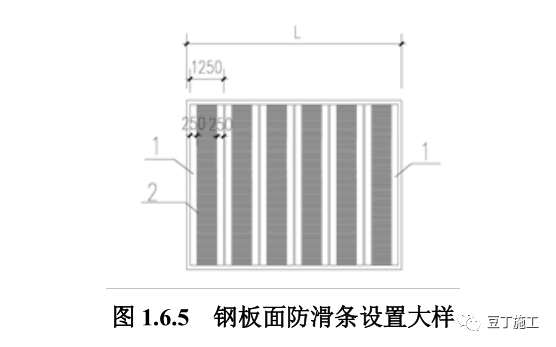 面板的防滑条设计采用 B25 钢筋,钢筋间距 300mm,钢筋与钢板之间的连接采用电弧焊连接,每间隔 300~400mm 焊接长度为 200mm 的焊接连接点。防护栏杆采用 16#工字钢与 48×3.5 的钢管组合而成,工字钢高度 1.2m。