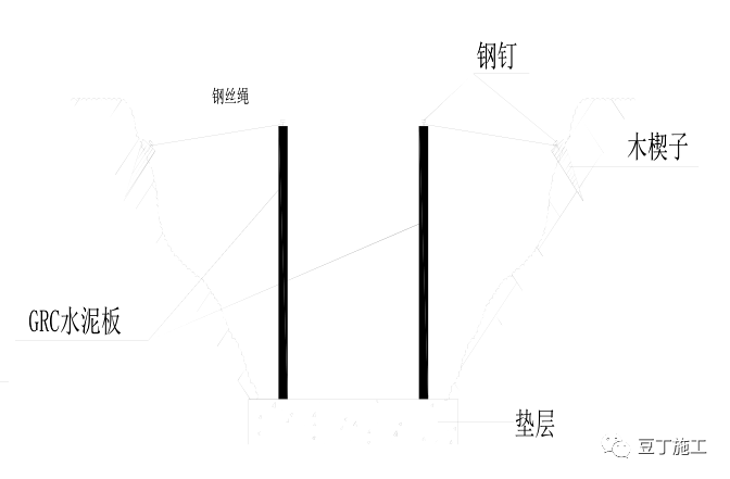 水泥板运输到工地采用塔吊吊装到基坑内,选择较平整部位放置,根据尺寸大小可以人工抬置施工部位进行安装,在开挖好的梁及承台体侧面嵌入大头木楔并拉线找直,把 GRC 水泥模板贴紧,梁及承台侧面木楔用大钉子加固。如梁及承台自身截面尺寸过大、过高,可用木方进行内支撑或外加固;在梁及承台连接的地方,水泥板可以根据现场需要切割成符合要求的尺寸。水泥板衔接时要严丝合缝,可在侧面用木方连接加固在一起,测其垂直度要符合要求,见下图。