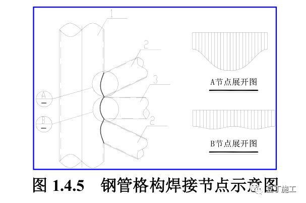 1)基坑土方开挖时,应分层开挖,每层土方挖净后,每段钢管混凝土格构间的钢管斜杆、钢管水平杆应及时安装并焊接牢固,确保整个钢管混凝土格构的整体稳定性。加固完成后,应对钢管格构进行表面清理、打磨,涂刷防锈漆。钢管格构焊接节点示意图见下图。