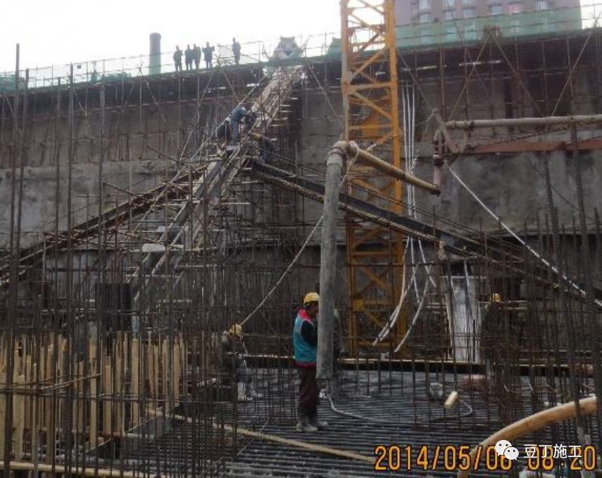 随着国民经济的迅速发展,超高层建筑越来越多,使得基础底板向超厚、超大方向迅猛发展。基础大体积混凝土施工时,一般采用分层推移施工法,这就要求施工速度必须要快,否则分层施工的混凝土之间由于时间过长就会形成冷缝,影响混凝土的质量。在基础大体积混凝土施工时,采用溜槽(管)施工、混凝土输送泵配合,可以大大提高混凝土施工速度,同时节约施工成本。