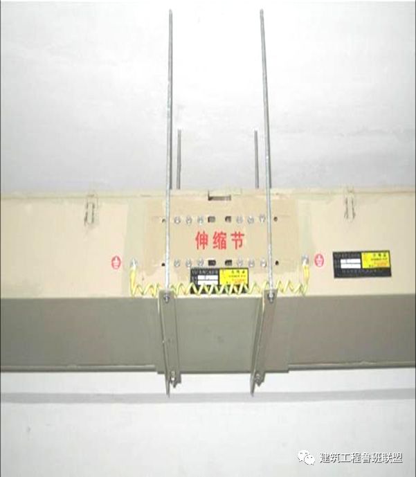 用连接板将电气桥架的伸缩节固定牢固,接地跨接线连接完善,伸缩接两边对称安装支吊架用以固定。