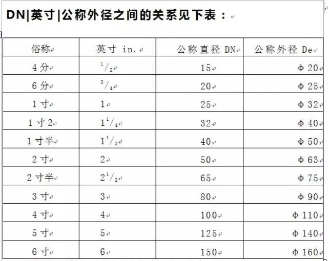 四寸管:4英寸:DN100; De主要是指管道外径,一般采用De标注的,均需要标注成外径X壁厚的形式; 主要用于描述:无缝钢管、PVC等塑料管道、和其他需要明确壁厚的管材。 拿镀锌焊接钢管为例,用DN、De两种标注方法如下:DN20 De25×2.5mm我们习惯于使用DN来标注焊接钢管,在不涉及到壁厚的情况下很少使用De来标注管道;但是标注塑料管就又是另外一回事了;还是跟行业习惯有关,实际施工过程中我们简略称呼的20、25、32等管道均是指De,而不是指DN,这里相差一个规格呢。不搞清楚很容易在采购、施工过程中造成损失。
